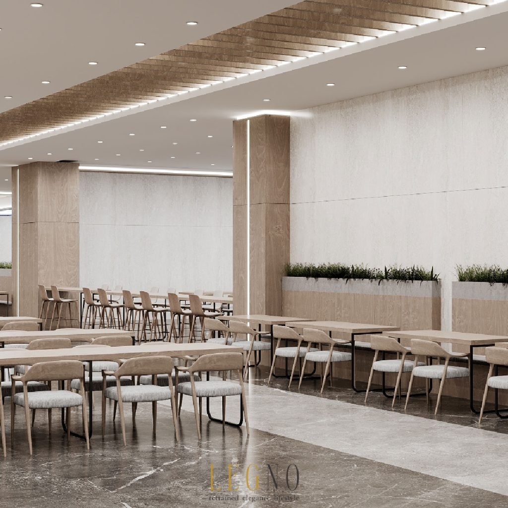 Beyond workstations, dining halls filled with long timber tables and soft-toned chairs establish a communal rhythm, while the repetition of linear lighting enhances the sense of flow.